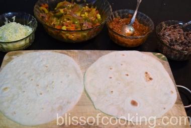 Vegetable Quesadilla is a classic Mexican dish. This cheesy treat is one dish meal made with tortilla (roti or flat leavened bread), vegetables and lots of cheese. Quesadilla can be baked or pan fried.