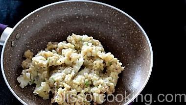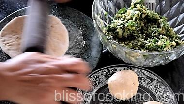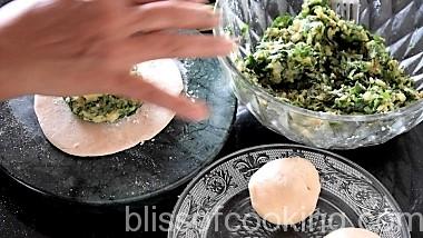 • Roll each portion into thick circle; place a large portion of stuffing mixture at the centre of each circle and bring the sides of the circle towards the centre to enclose the filling completely.