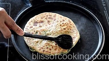 • Heat the tava or a skillet on medium heat; place the rolled paratha gently on it. Cook on both sides, using little ghee till the parathas are golden brown.
