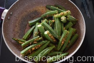 - Heat the oil in a non-stick pan; add rai, asafoetida, bhindi and saute till well coated with oil.