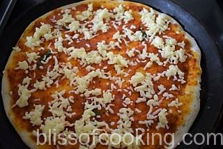 - Apply 2 to 3 tablespoon pizza sauce on the base.
