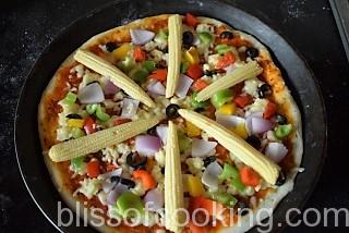- Sprinkle ¼ cup grated cheese on the sauce; arrange peppers, onions, baby corns and olives.