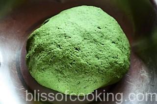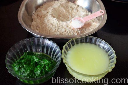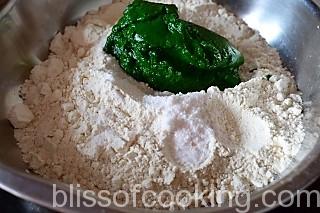 • In a large bowl add aata, salt, spinach pure and mix.