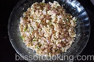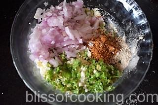 • Now mix all the ingredients for the stuffing. Check the seasoning and adjust to your taste. I prefer the spice to be a little on the higher side.