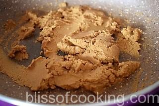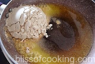 - Heat ghee in a pan; add atta and saute on low heat till the atta turns brown and aromatic.