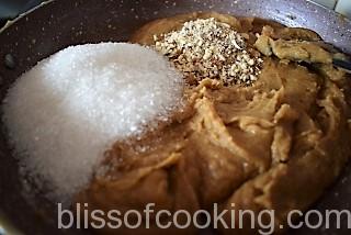 - Add sugar, almonds and stir till the sugar melts and the halwa is thick.