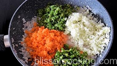 • Add carrot, beans, cabbage, capsicum and saute for 4 minutes on high heat.