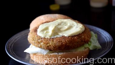 • Now spread 1 spoon of mayo on the Pattie and place a slice of onion and close with the second piece of bun.