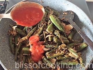- Now add the tomato puree and the left over stuffing and saute till the bhindi is cooked.