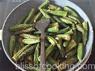 - Heat 1spoon oil, add the bhindi and saute on medium heat till half cooked.