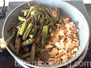 - In another pan heat rest of oil, add jeera, garlic, onion and saute for 2 minutes and then add to the bhindi.