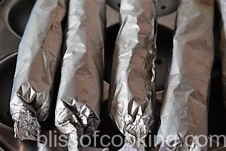 - Wrap each dog in parchment paper and then aluminium foil. Twist ends of the foil shut.