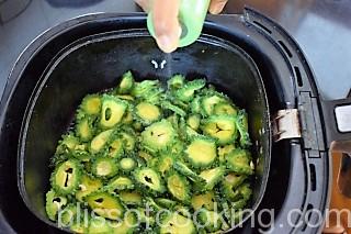 - Now air fry the Karela till crisp. Spray oil before frying. Set aside.