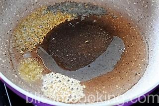 • Heat oil in a pan; add jeera, mustard, hing, til and let it crackle.