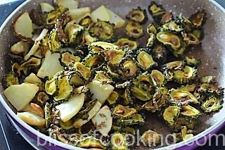 • Add the Karela, alu , mango and saute for 2 minutes.