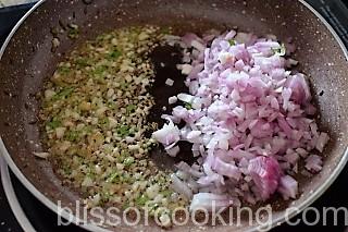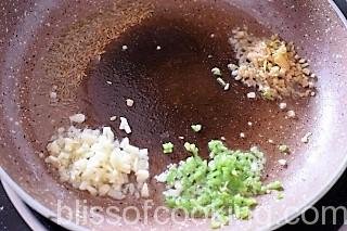- Heat 1spoon oil in a pan: add jeera, and then add ginger, garlic, chilli, onion and saute for 2 to 3 minutes.
