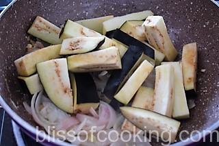 - Now add the eggplant and saute for 2 to 3 minutes.