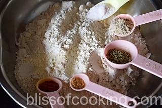 - In a large bowl add atta, salt, amchur, red chilli, sauf powder, hing and mix.