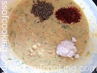 - Add salt, chilli powder, jeera, chopped coriander, carrot, capsicum, green chilli, ginger and mix well.