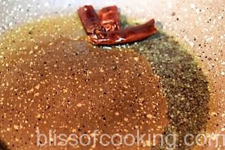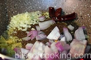 - Heat ghee in a pan; add the mustard, red chilli and then add ginger, garlic, onion and saute for a minute.