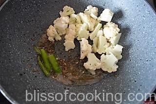 - Add cauliflower and green chilli, saute and cover, cook for 2 to 3 minutes.