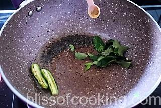 - Heat oil in a sauce pan; add mustard, green chilli, hing and curry leaves.