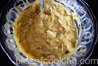 - Mix all the ingredients for the pakora except oil. Make thick batter by adding enough water.