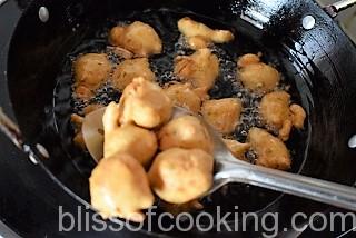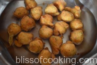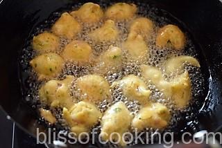 - Heat oil and make very small pakoras. Fry till golden brown.