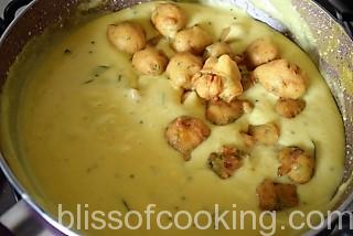 - Gently squeeze water out of the pakoras and tip them in the Kadhi.