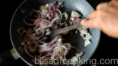 - Heat oil in a pan; add garlic and onion and saute for 2 minutes.