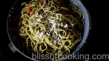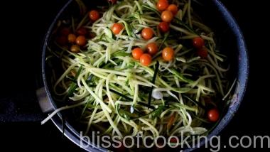 - Now add tomato, zucchini, pesto, salt and pepper and toss.