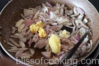 • Heat oil in a pan; add jeera, onion, ginger, garlic. Stir for 2 to 3 minutes.