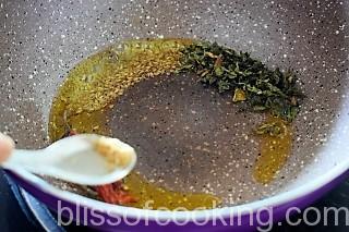 - Heat oil in a pan; add jeera, red chilli, kasuri methi and hing.