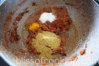 - Now add haldi, dhania, red chilli powder and salt and saute for a minute.