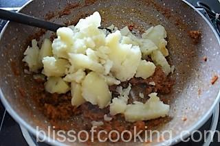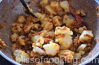 - Add the crushed aloo and saute for a few minutes.