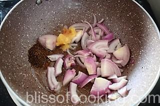• Heat oil in a pan; add crushed ajwain, garlic, onion and saute.