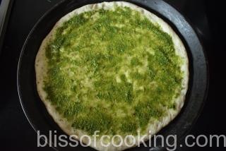 - Apply 2 to 3 tablespoon pesto sauce on the base.