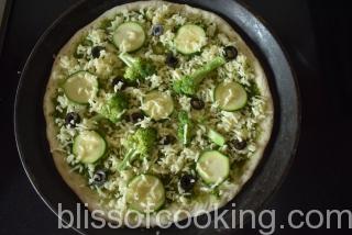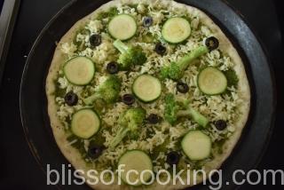 - Sprinkle 1/4 cup grated cheese on the sauce; arrange zucchini, broccoli and olives.