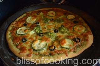 This Pesto Pizza is made with homemade pesto sauce and homemade pizza dough. The pizza uses fresh ingredients and tastes yummy. This pizza is topped with zucchini, broccoli and fresh basil grown in my Balcony. This pizza is a must try …. If you want you can use store bought pizza base.