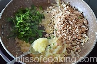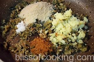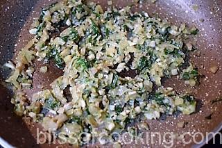 - Now add garlic, chopped mushroom stem, spinach and saute.