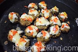 - Brush all the mushrooms with butter and fill in with the stuffing and top with red peppers.