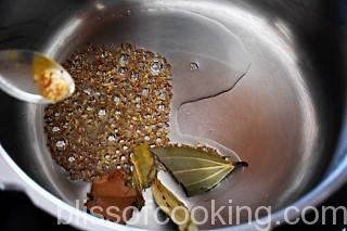 - Heat oil in a pressure cooker; add jeera, tej patta, hing, green chilli, ginger and saute for few seconds.