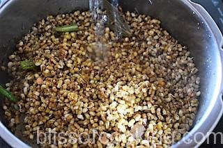 - Pour in 1/2 cup water and close the cooker and give 1 pressure on medium heat, reduce the heat to low and cook till 1 more pressure.