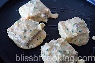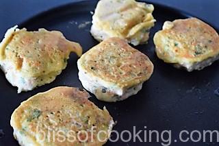 - Dip the bread pieces and place on the hot tava and cook till bubbles appear on the top.