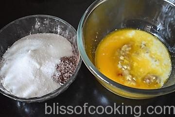 - Add the dry ingredients to the milk mix in two batches, mixing gently by cut and fold method. Do not over mix or else the cake will be dense.