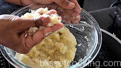 - Mash the potatoes; add rice flour, corn flour and mix well to form a dough. Set aside.