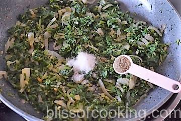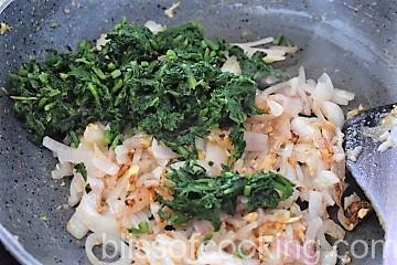 - Squeeze out the liquid from the spinach and add to the onions.