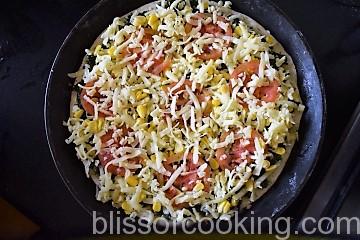 - Sprinkle a layer of cheese, arrange tomato slices and spread corn niblets.