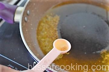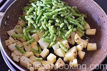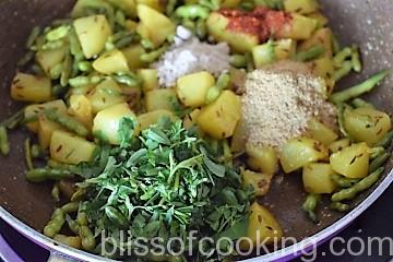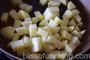 - Heat oil in a pan; add jeera, then hing and then the potatoes. Saute for 2 minutes, cover and cook till half cooked.