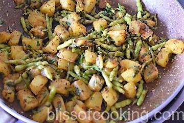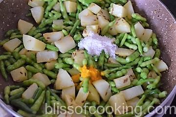 - Add salt, haldi and toss to mix. Cover and cook till almost done.